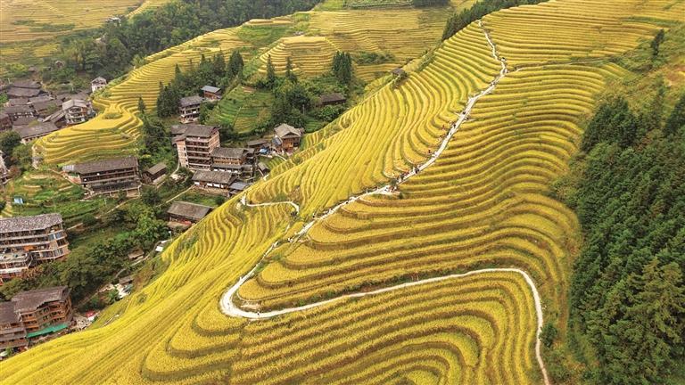 10月12日,游客在广西桂林市龙胜各族自治县龙脊梯田景区观光游览。 (新华社发)
